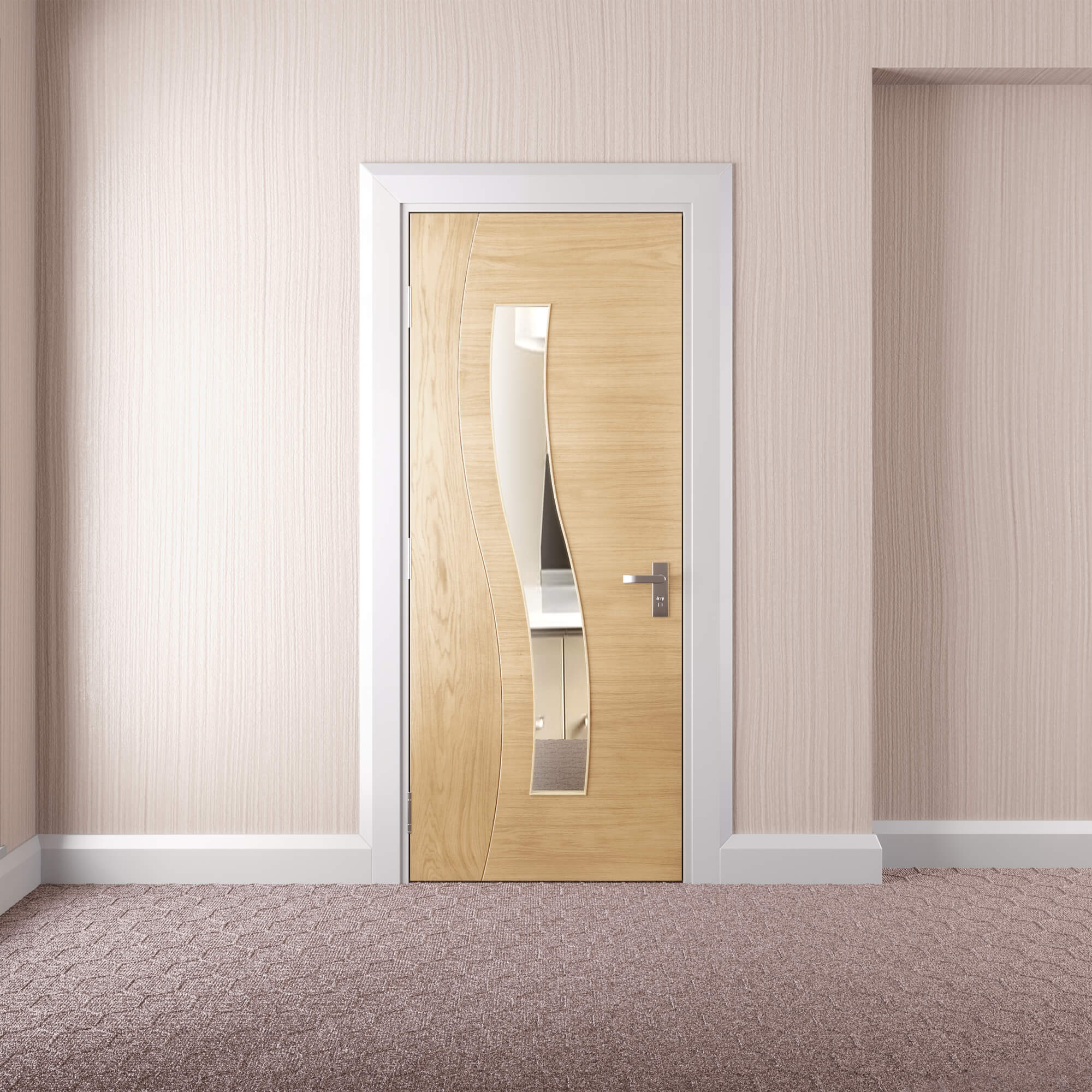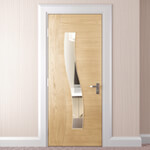 Joseph Miles Cadira Internal Door with 1 Clear Glazed Light - Prefinished Oak is designed for homes needing bright and fresh interiors. Manufactured from quality materials with long, asymmetrical curves accenting the beauty of crown-cut oak profile, the door is versatile and easy to install in a range of different environments. It is glazed with clear tempered glass and is FSC-certified. This pre-finished door is a great alternative to standard boring doors, with its slim, curved, glazed panel carved into the door surface, allowing for a new-age approach to interior decoration.